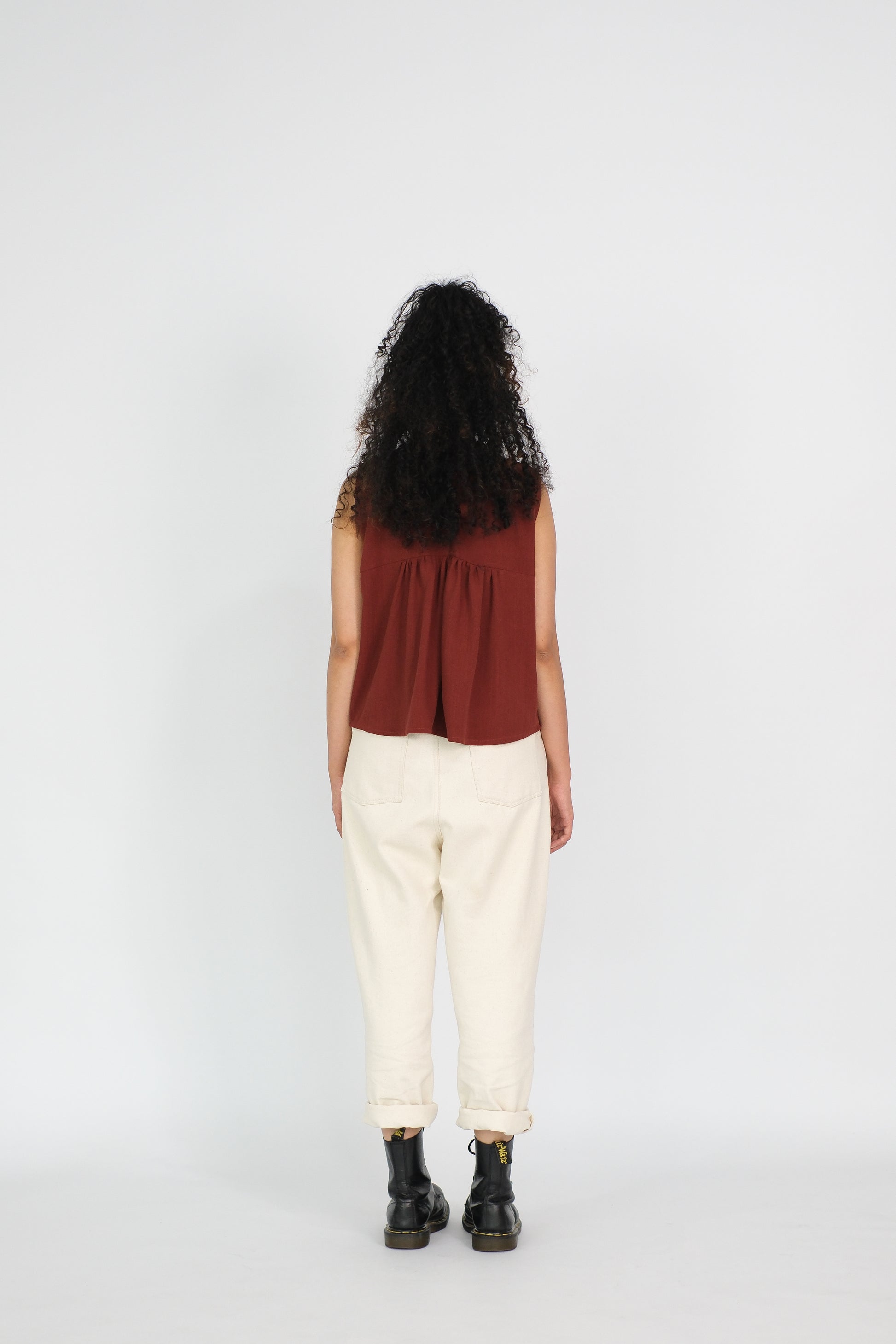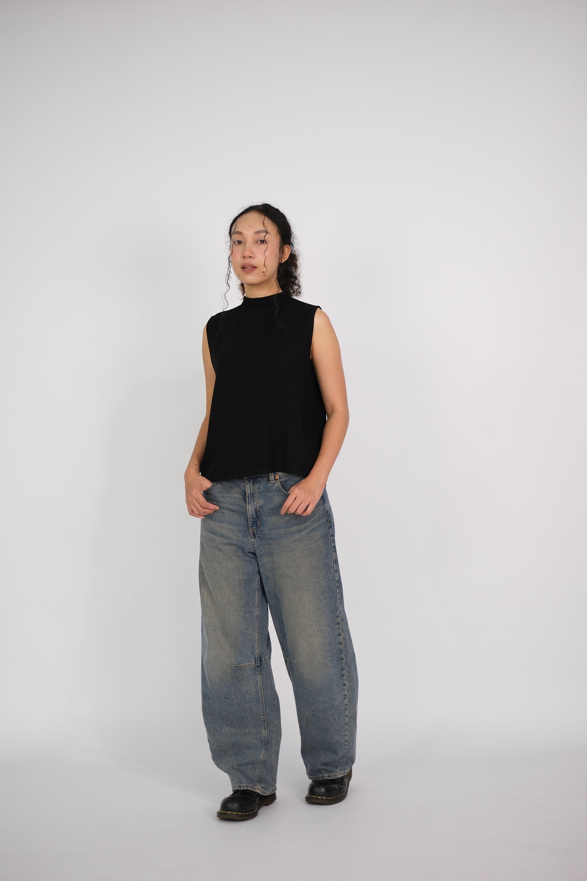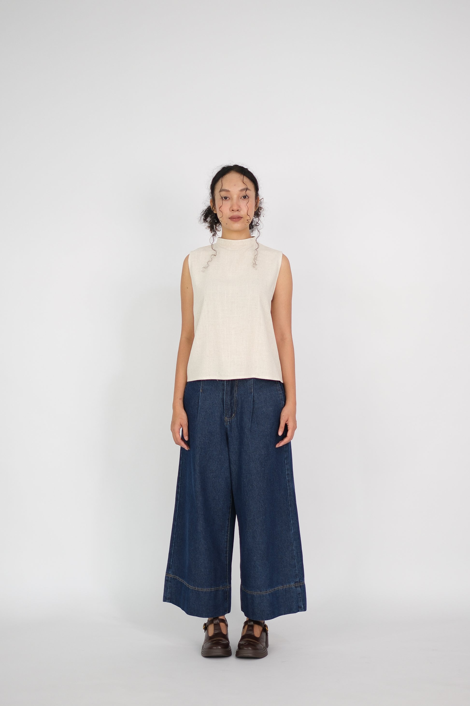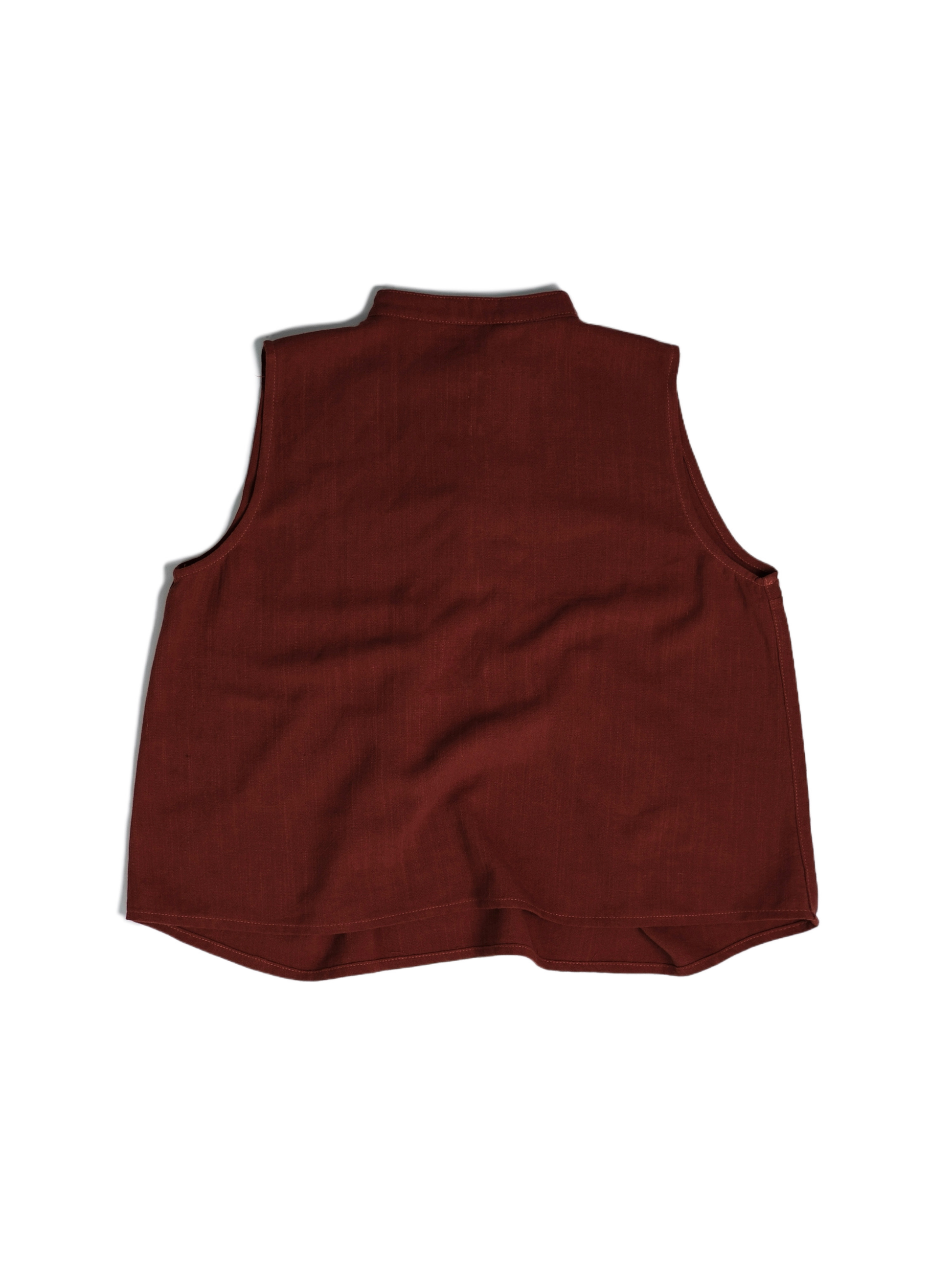 a sleeveless top with a mandarin collar and a soft, loose drape. the back-gathered detail adds shape and dimension while keeping the silhouette relaxed and easy. designed to look seamless as an inner layer under outerwear, yet cool enough to wear on its own.